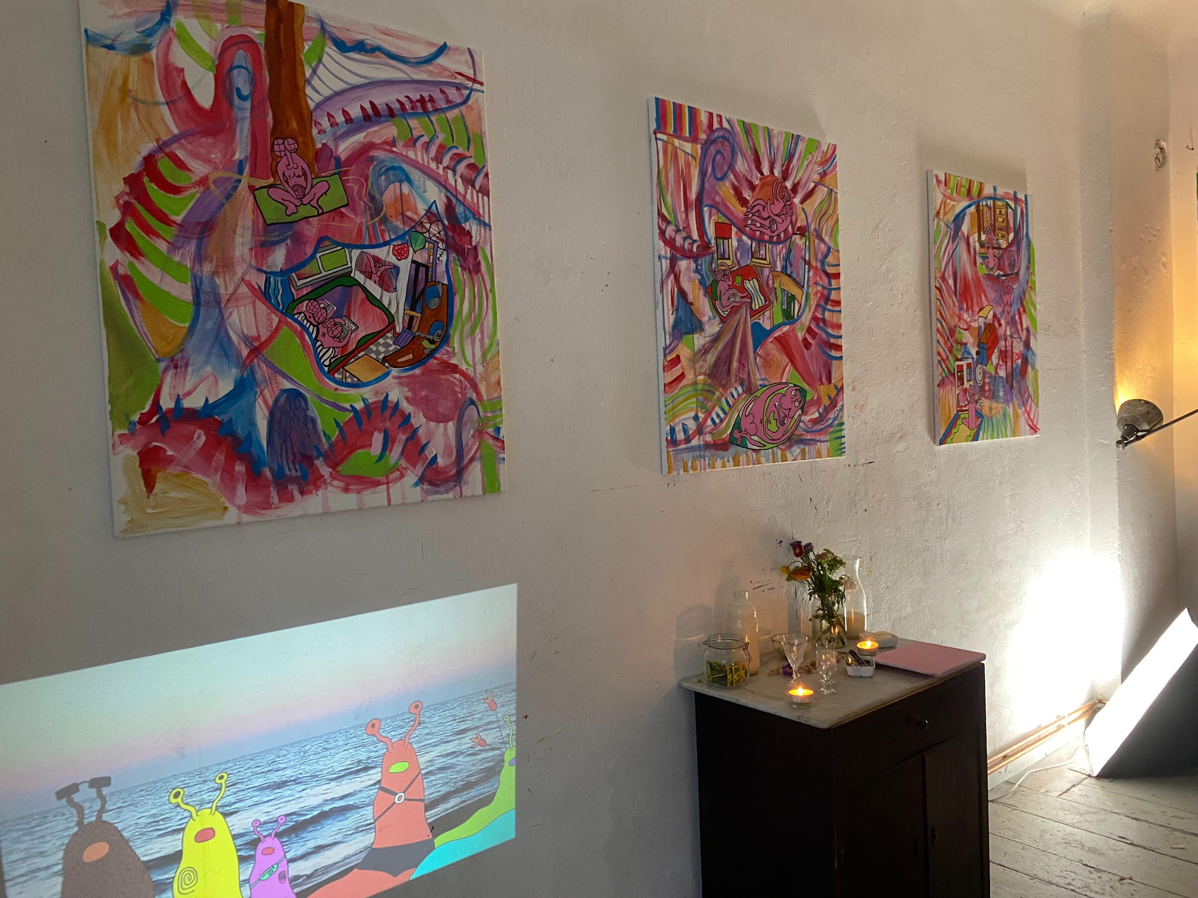 Artist statementThe figures in my paintings are called Flybitches. Their nudity and gender neutrality capture a sense of human essence, removing the idea of identity that is formed through individualism. They are autobiographical yet they could be anyone, they act as mirrors to the spectator. All Flybitches have the same face. Everyone has a personality, an ego and a conditioned mind, these are all things that die. What does not die is the essential self, the soul, the spirit, the consciousness, that exists, equally, in its absolute divinity, in every single one of us. No better or no worse from one another they bring humility. The sameness represents the oneness of the collective consciousness.Through the paintings an intuitive autobiographical narrative has unfolded. The early Flybitches were carefree, dancing on open airs, chilling on Cospudener See, Grilling in allotments or joyfully painting in the studio. Over time, as life unfolded the figures started to represent the essential matriarchal archetypes: “The Mother”,“The Martyr”, “The Mentor” "The virgin”,“The warrior” and “The goddess”.The paintings depict feminine looking bodies, they come from situations, dreams, visions and fantasies from my own life. Through the repetition of the nude figures I intend to reclaim the narrative of feminine bodies, to give them a stage in which to stand in their power and essence without having to be sexualised.My paintings started to shift when I became pregnant with my daughter. In the unexpectedness of what was to come I found myself painting abstract landscapes. I think of the abstract as an intuitive depiction of the psyche. I started to depict my Flybitch world, painted on top of these abstract landscapes, with parts shining through, a glimpse through windows and doors, depicting another world, an unknown future, or a hazy past. A window into the body of the Flybitch also appeared showing the growing foetus that would soon become part of my world. Previous paintings also started to appear within the interiors of present paintings giving a greater sense of depth and self reference.I am very interested in psychology and the subconscious. Painting has been and continues to be an intrinsic part of my personal healing journey. I am very interested in the creative process being something that connects one to source, whatever that may mean to each individual. Whether it is God, the universe or the self, these things are all related. After giving birth to my daughter I was struck by an overwhelming sense of love, joy and such an expansion of my heart, however, the flipside to that was that I was also struck by such an enormous sense of grief. I am interested in finding the balance between dualistic opposites as one can not exist without the other in forming something which is organic and whole.