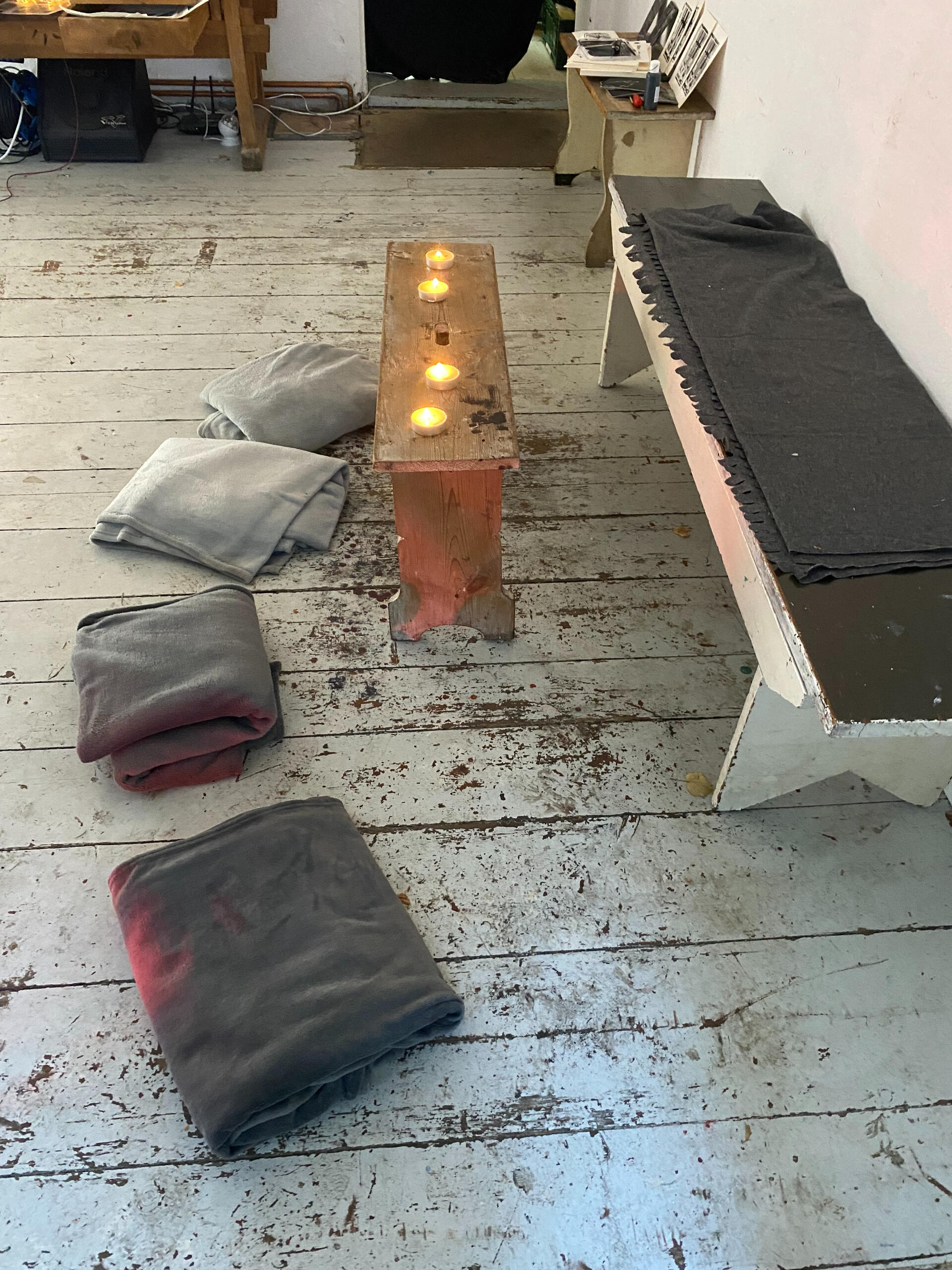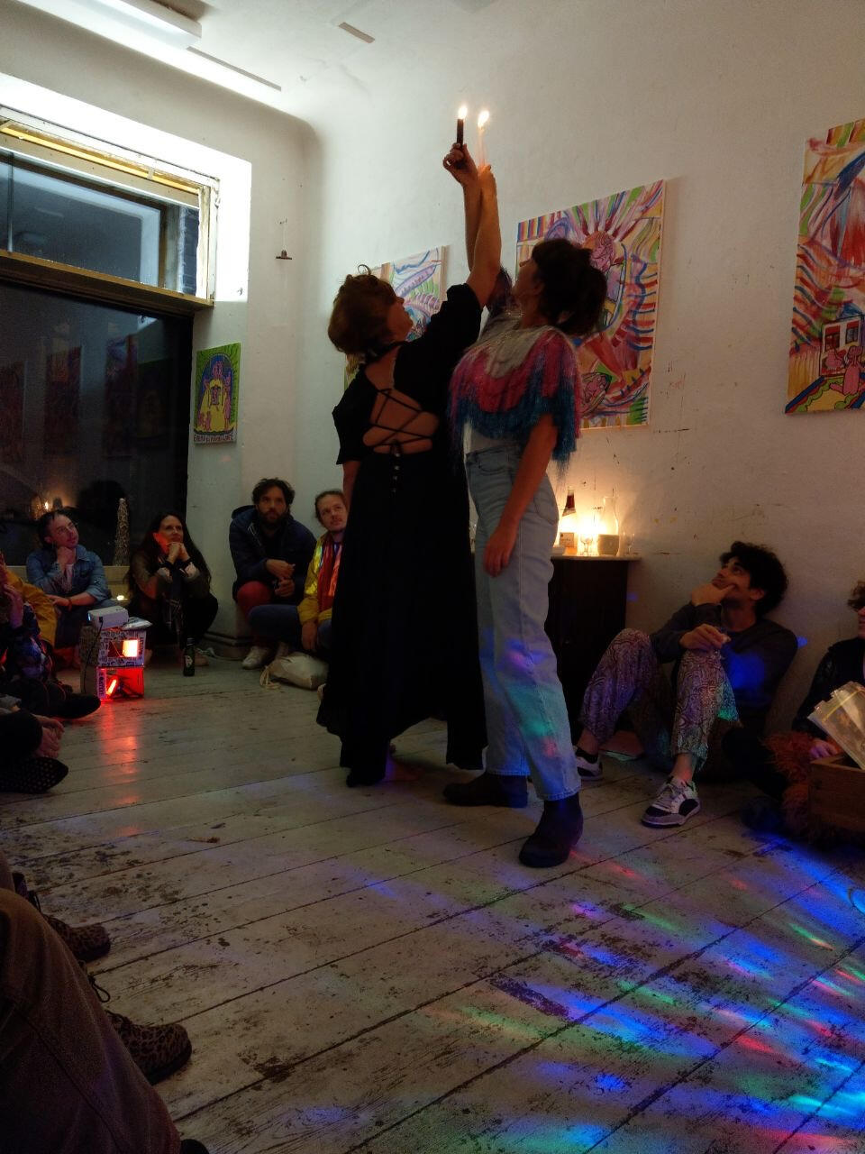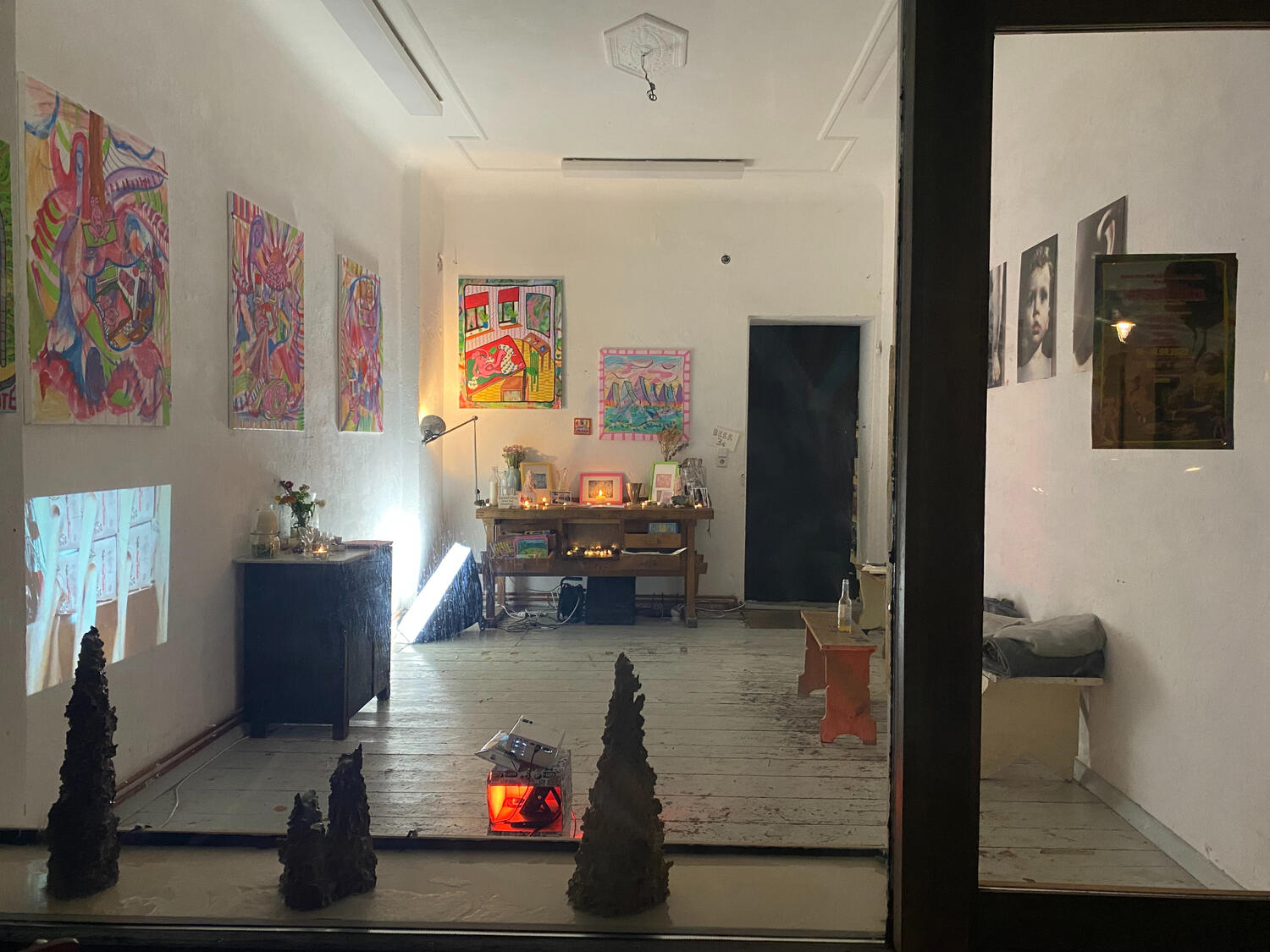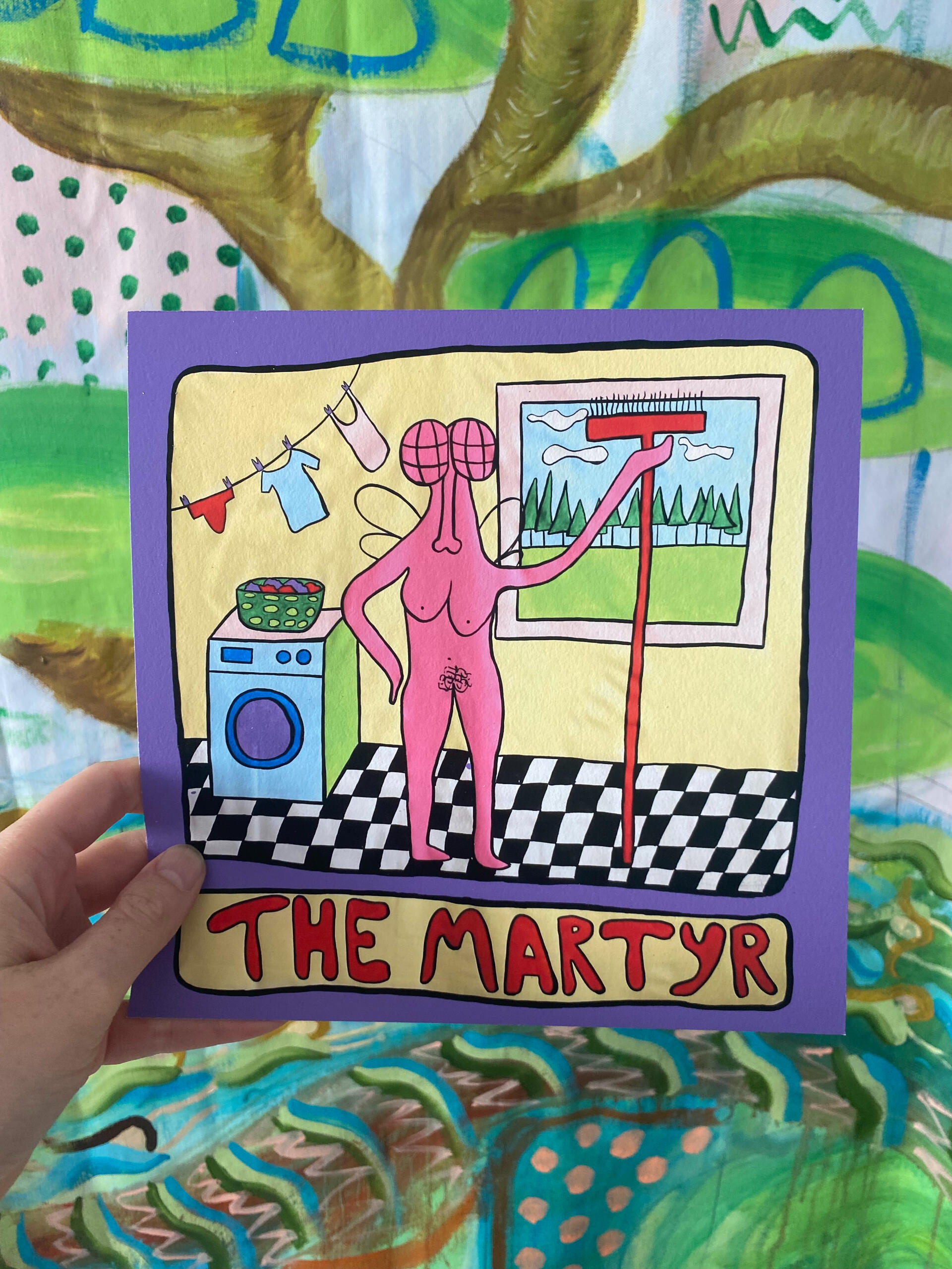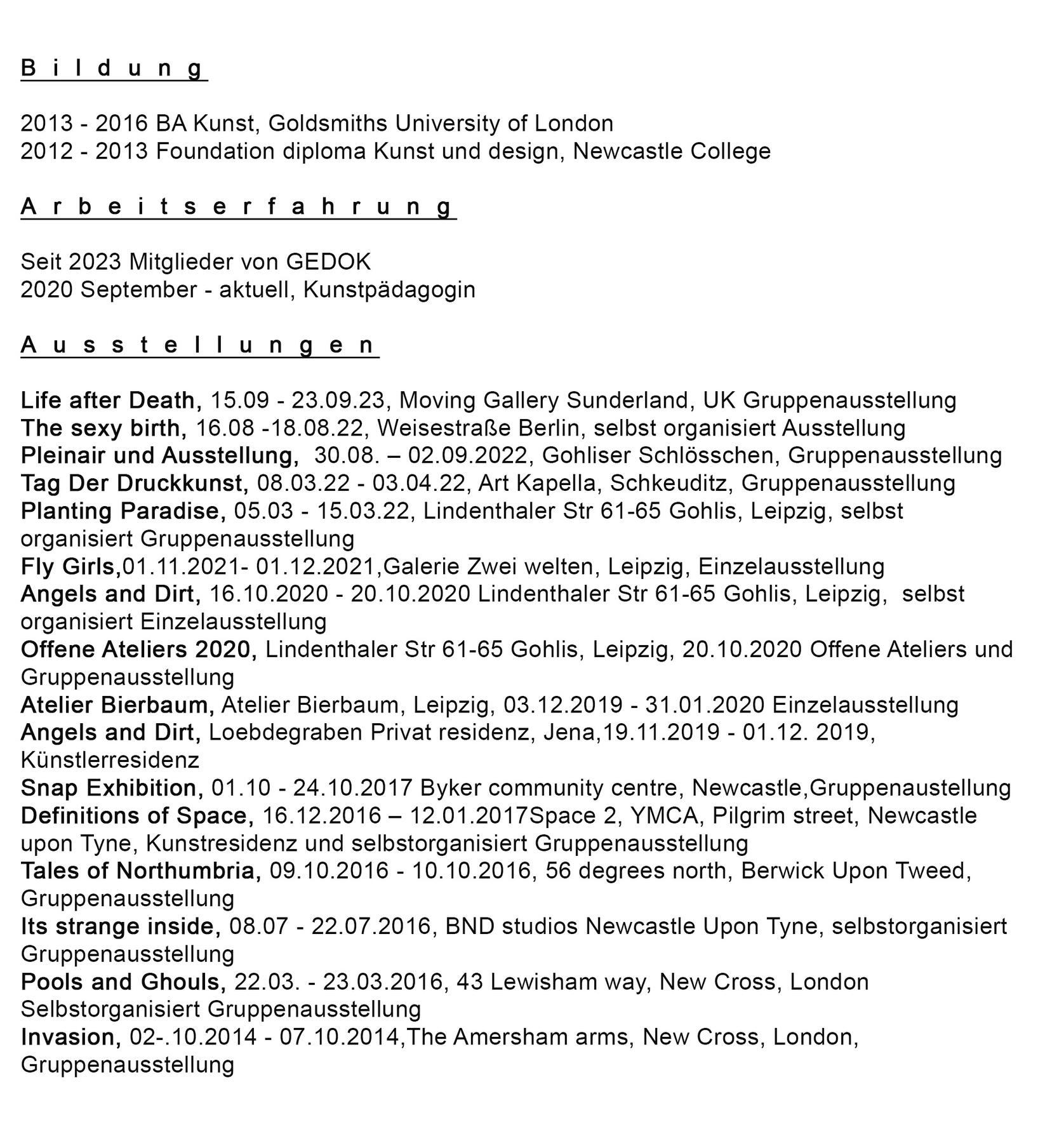 Artist statementThe figures in my paintings are called Flybitches. Their nudity and gender neutrality capture a sense of human essence, removing the idea of identity that is formed through individualism. They are autobiographical yet they could be anyone, they act as mirrors to the spectator. All Flybitches have the same face. Everyone has a personality, an ego and a conditioned mind, these are all things that die. What does not die is the essential self, the soul, the spirit, the consciousness, that exists, equally, in its absolute divinity, in every single one of us. No better or no worse from one another they bring humility. The sameness represents the oneness of the collective consciousness.Through the paintings an intuitive autobiographical narrative has unfolded. The early Flybitches were carefree, dancing on open airs, chilling on Cospudener See, Grilling in allotments or joyfully painting in the studio. Over time, as life unfolded the figures started to represent the essential matriarchal archetypes: “The Mother”,“The Martyr”, “The Mentor” "The virgin”,“The warrior” and “The goddess”.The paintings depict feminine looking bodies, they come from situations, dreams, visions and fantasies from my own life. Through the repetition of the nude figures I intend to reclaim the narrative of feminine bodies, to give them a stage in which to stand in their power and essence without having to be sexualised.My paintings started to shift when I became pregnant with my daughter. In the unexpectedness of what was to come I found myself painting abstract landscapes. I think of the abstract as an intuitive depiction of the psyche. I started to depict my Flybitch world, painted on top of these abstract landscapes, with parts shining through, a glimpse through windows and doors, depicting another world, an unknown future, or a hazy past. A window into the body of the Flybitch also appeared showing the growing foetus that would soon become part of my world. Previous paintings also started to appear within the interiors of present paintings giving a greater sense of depth and self reference.I am very interested in psychology and the subconscious. Painting has been and continues to be an intrinsic part of my personal healing journey. I am very interested in the creative process being something that connects one to source, whatever that may mean to each individual. Whether it is God, the universe or the self, these things are all related. After giving birth to my daughter I was struck by an overwhelming sense of love, joy and such an expansion of my heart, however, the flipside to that was that I was also struck by such an enormous sense of grief. I am interested in finding the balance between dualistic opposites as one can not exist without the other in forming something which is organic and whole.